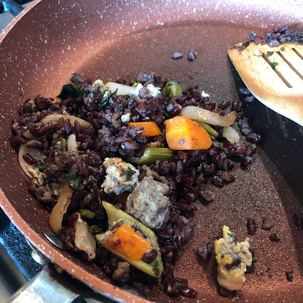 Ingredients: Rice (duh! but I like brown rice and purple rice, I’ll tell you why later), rock salt, black pepper, avocado oil, carrots, garlic, celery, eggs, sausages, dried shrimp, shiitake mushrooms, soy sauce, onions. It looks like a long list but you don’t have to have everything. I’ve made it with just a handful of the ingredients and no Kitchen God ever beaten me with a wooden spoon before, so you are safe.