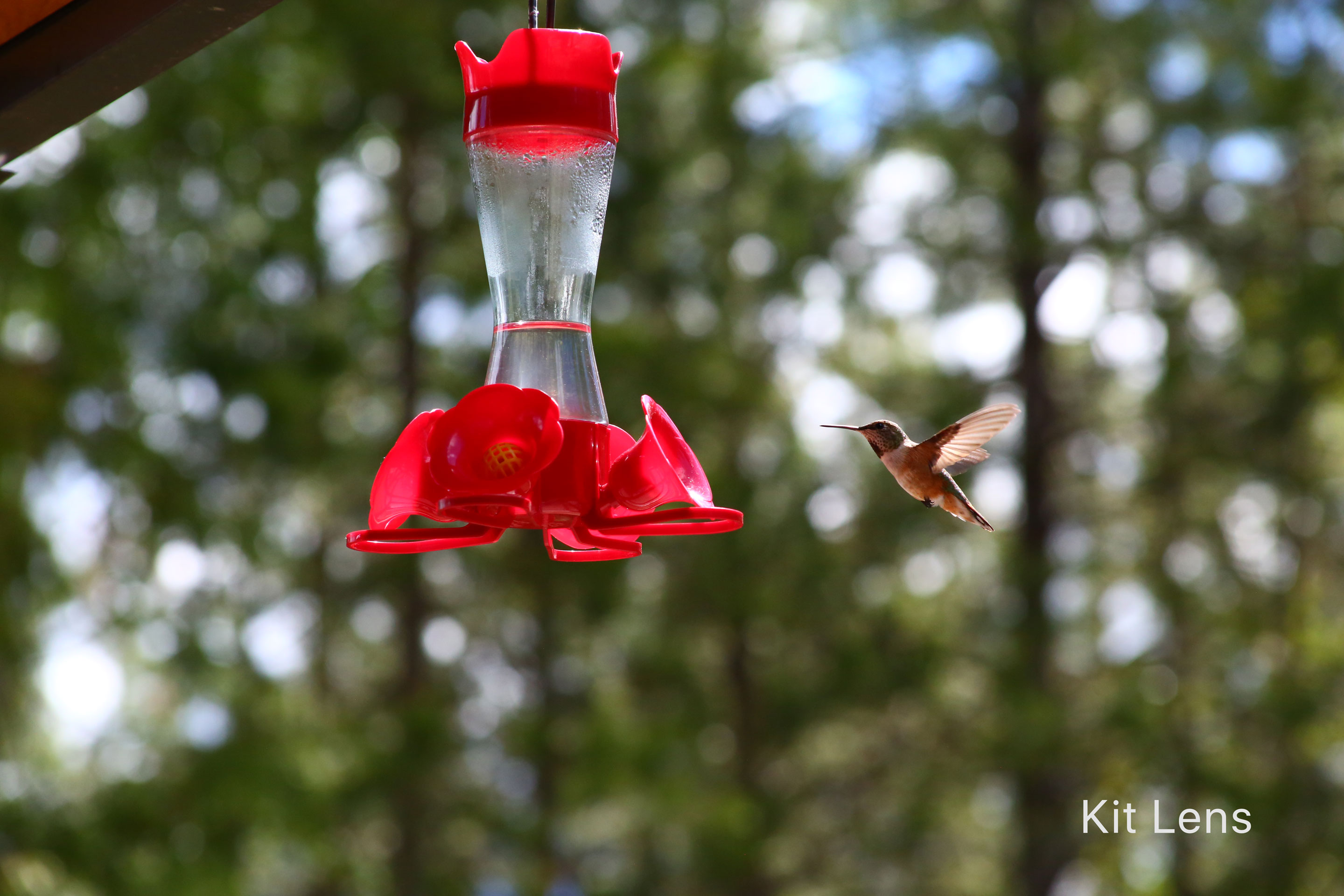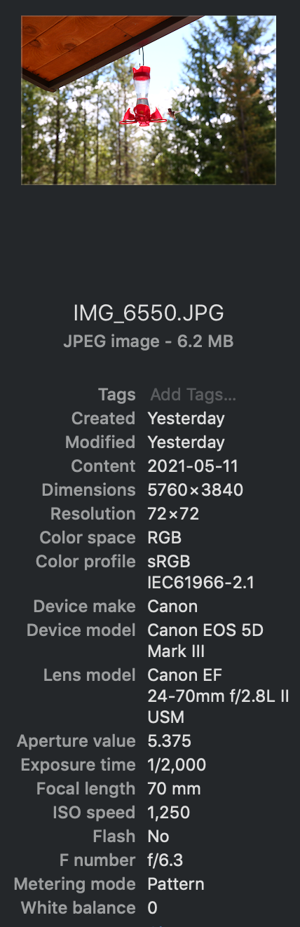 I set up the camera near the birdfeeder and tried to remain discrete. With the Kit Lens I was able to set up 4.5 meters away. Hummingbirds are shy so this helps a bit. Camera shutter didn’t scare them away as often. With the L-Series Lens my zoom was capped at 70mm. (My pocket isn’t deep enough for the L-Series Zoom Lens at the moment.) Therefore I had to move within 1.5 meters of the feeder to get a decent shot. It took a bit more time but eventually the birds didn’t mind the camera. This test is not about keeping the zoom length the same. I’m simply looking for the best photograph I can shoot with the lens.