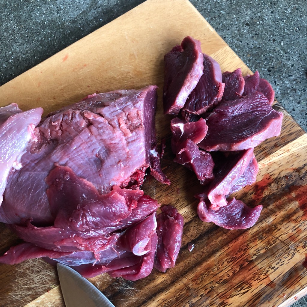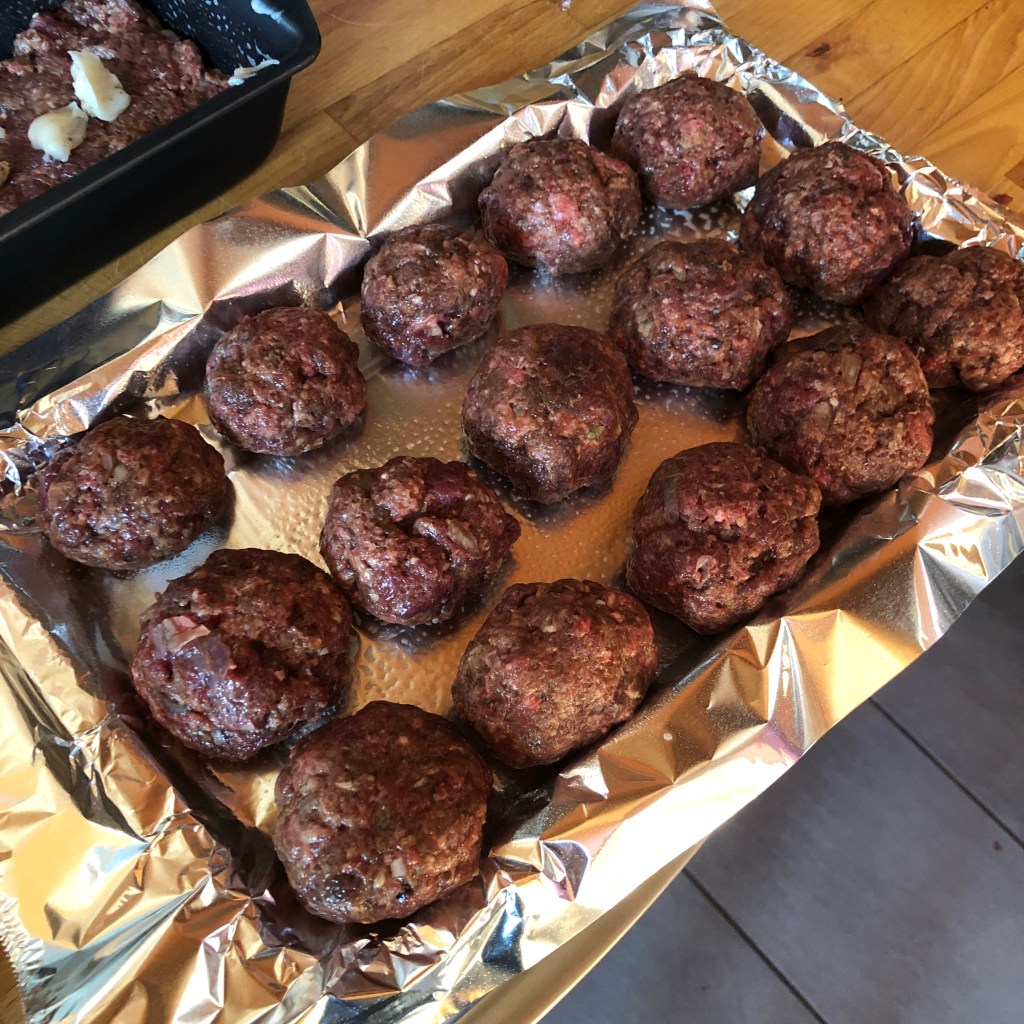 I clean the bird and fillet the breasts. This takes about an hour. The recipe calls for minced meat so I use Chinese cleaver to chop the tough game meat up. Then I mix it with some hamburger beef, chopped onions, garlic, salt, grape juice and Worcester sauce. I let it marinate for a few hours and make meatballs out of them. I place them on cookie sheets and roast at 350 degrees F for 25 mins. Then I slow cook them in a Dutch oven for another 30 mins immersed in tomato sauce, red wine and Italian seasoning.